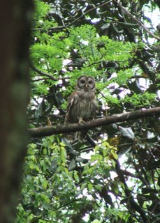 Often heard, seldom seen. There are several of them in the woods nearby and sometimes they start hooting steadily at each other (arguments? love songs? who knows?). A few days ago my wife and I were out in the yard around sunset and heard him (her?) from much closer than usual. She managed to figure out where he (she?) was and get this picture. The distance actually was a good deal greater than it may appear—she zoomed in a good bit, and the picture has been cropped some.
