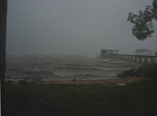 The view from under an umbrella during a thunderstorm a couple of Saturdays ago. I really like watching storms come across the bay.