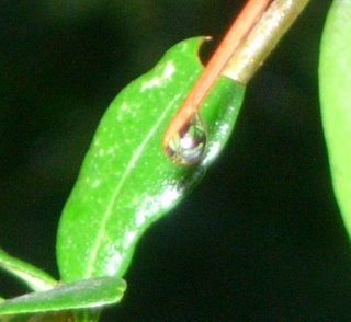 I know, a picture of a drop of water is a cliche, but I like the way you can see the reflection of leaves on the tree (the live oak in our front yard) in it. You might have to click through to the slightly larger version to see that. Too bad it isn’t in better focus—there really wasn’t enough light.