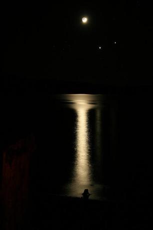 I was vaguely aware of having seen a news story or two about this, but wasn’t even thinking about it when I walked out after work yesterday and saw something very much like the first picture above over in the western sky, except that what I saw was much sharper and clearer, with the sky absolute black and the moon and planets very bright silver. When I got home I walked down to the bay (freezing) and saw something a bit like the second picture, except that the wind was blowing hard and the water very rough.