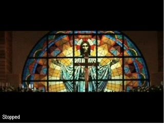 Originally there was no crucifix in the sanctuary. I think this is against the rules; anyway, there were complaints about the lack, and a crucifix was added, atop that curved partition. If you stand in the right place in the center aisle, the crucified figure is aligned with the resurrected one. Unfortunately I don’t have a good picture showing this, but you can get the general idea from this one, which I extracted from a screen capture of the video tour (see parish web site link below)—I suppose I should have edited out the word “stopped,” but it’s late now.