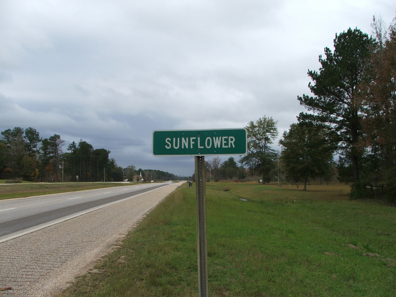 This post is more than a year and a half overdue. It’s connected with this one from November 2007, which mentioned the little town, or alleged town, of Sunflower, Alabama. In the other post I noted that “its existence is noted only by one forlorn street sign that stands beside the highway, looking very weary of time.”