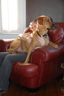 This is Ellen and her dog Comrade (hers and her husband’s). This is the dog I referred to in a comment, on the dog and cat post below, as “humongous,” a description with which she disagreed. Her theory seems to be that if it can sit on your lap it isn’t humongous. Though he isn’t exactly sitting on her lap.