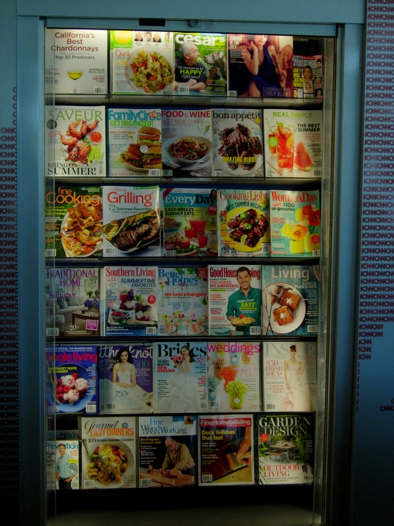 On the basis of this, it would seem that women are mainly interested in food, houses, and being sexy, while men are interested in sports and sex (fitness has some connection to both). Those three blacked-out spaces at the top of the men's section are sex magazines apparently too graphic for public display. Also maybe that women read more than men.