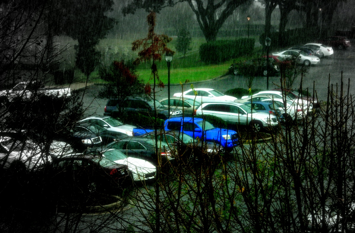 This was the view from my office window on a rainy day some weeks ago. The truck belongs to a co-worker. It's not really little, compared to traditional pick-ups, of course (Little Blue Truck is the name of a children's book). It really stands out among the generally dull-colored cars in the parking lot. I'm not sure when eye-catching colors fell out of favor in the automobile world–sometime in the 1980s? 1970s? (I confess, this photo has been digitally messed with, but the truck did stand out.)