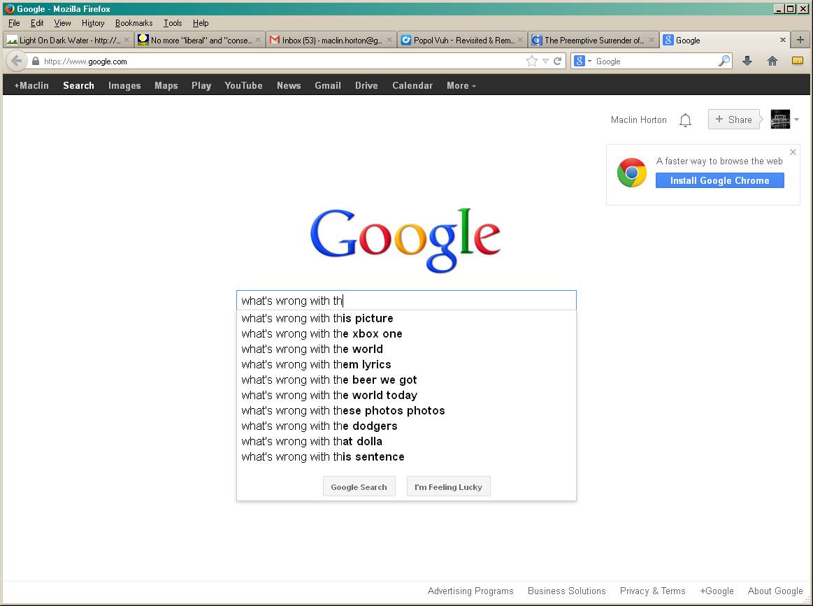 Sometimes Google's auto-suggest feature produces interesting, amusing, and even vaguely poetic results. The other day I was looking for the blog What's Wrong With the World, which I read occasionally but haven't bookmarked, and this was Google's attempt to be helpful (click on the image to enlarge it):