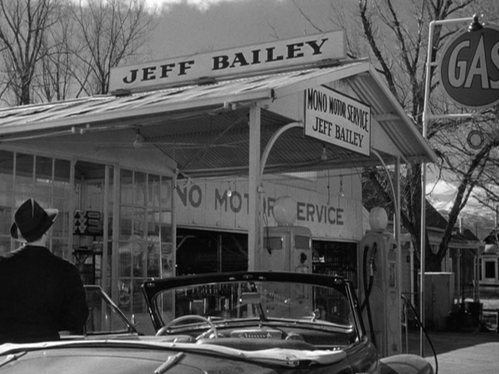 We see a man in a dark hat and a dark coat driving a dark car into Bridgeport. It’s a nice-looking little town, and in fact a real town, in which these scenes were filmed. The man isn't Mitchum’s character, but someone out of his past, Joe Stefano. Stefano is looking for Mitchum’s character, who is introduced first as Jeff Bailey but is actually named Jeff Markham, and who runs a garage in Bridgeport. (If you wonder why it’s called “Mono Motor Service”, it’s because Bridgeport is in Mono County.)
