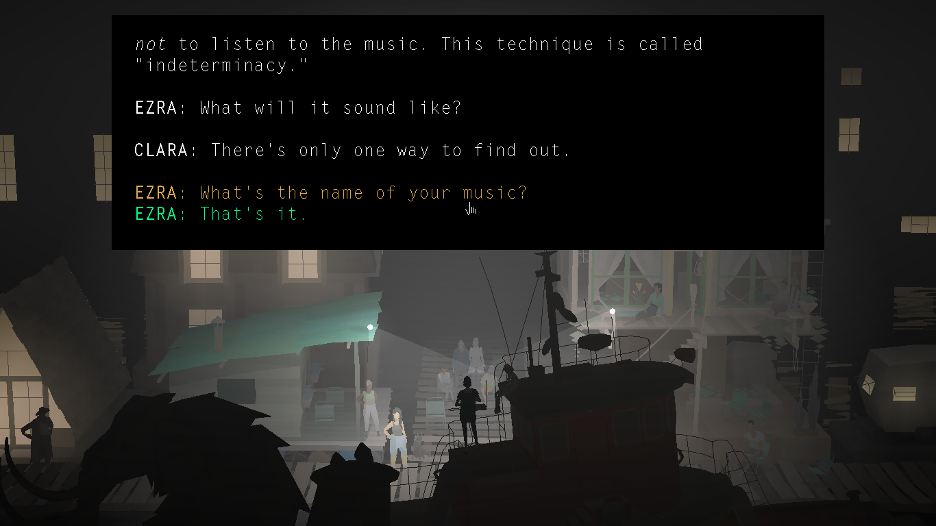 The green and yellow/orange lines at the bottom of the text are possible responses Ezra can make to Clara. You choose one and click on it .