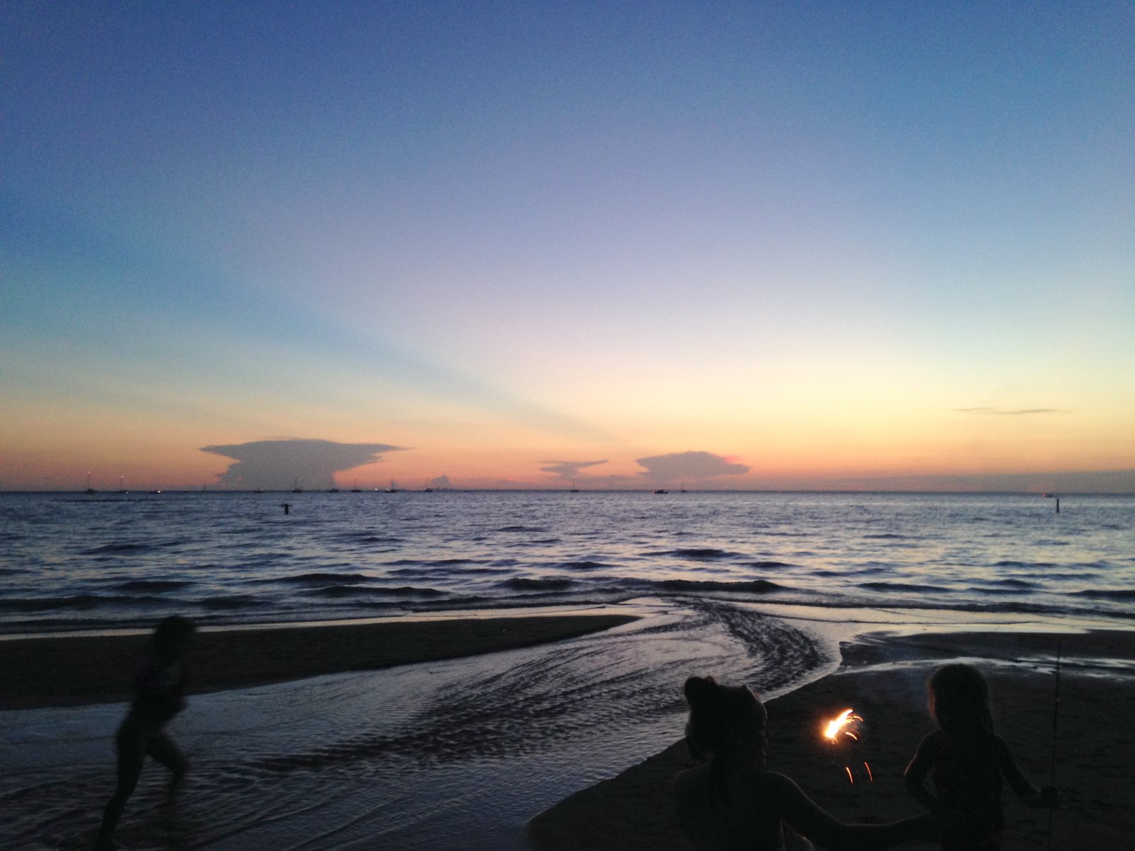 Here's an image from my Fourth of July. From here we have a great view of the fireworks launched after dark from the end of the big pier, three-quarters of a mile or so away over the water.