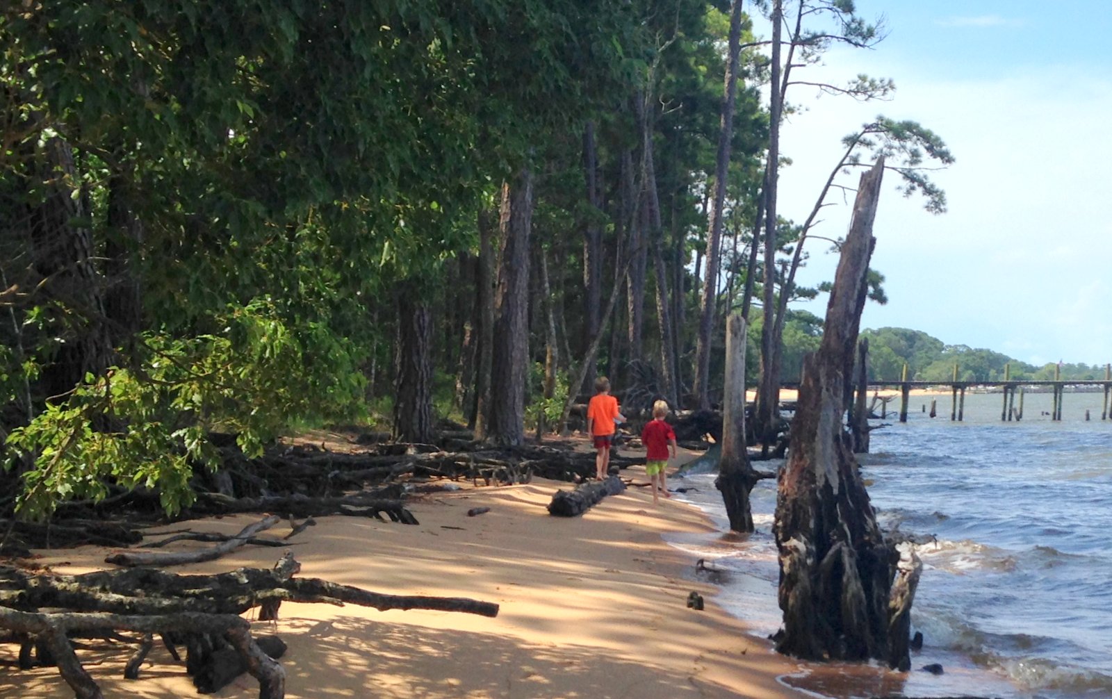 One thing we've done every day unless the weather prevents us is spend a while splashing around in the bay. Happily, Friday morning was sunny and almost windless. After they'd gotten tired of playing in the water, I suggested that we walk up to the public beach and park, a quarter-mile or so away, just for a change. There are ponds there with ducks and geese and we hadn't taken that walk for a while. Depending on the water level, it can involve a lot of clambering over fallen trees or wading around stumps.