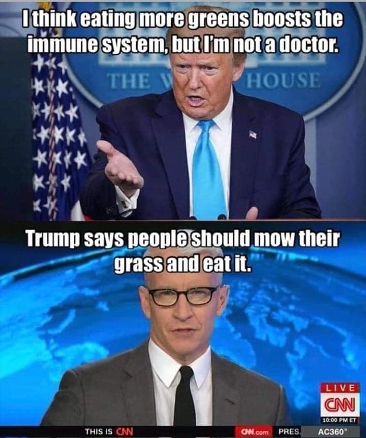 I'm thinking right now of the insane bit of controversy that's happened over the past few days. Trump wondered out loud whether disinfectants should be studied as possible measures against COVID-19. That was immediately turned into "Crazy Trump Tells People to Drink Disinfectant." And then they warned people not to do it. As if the idea would ever have occurred to anyone without the help of the press.