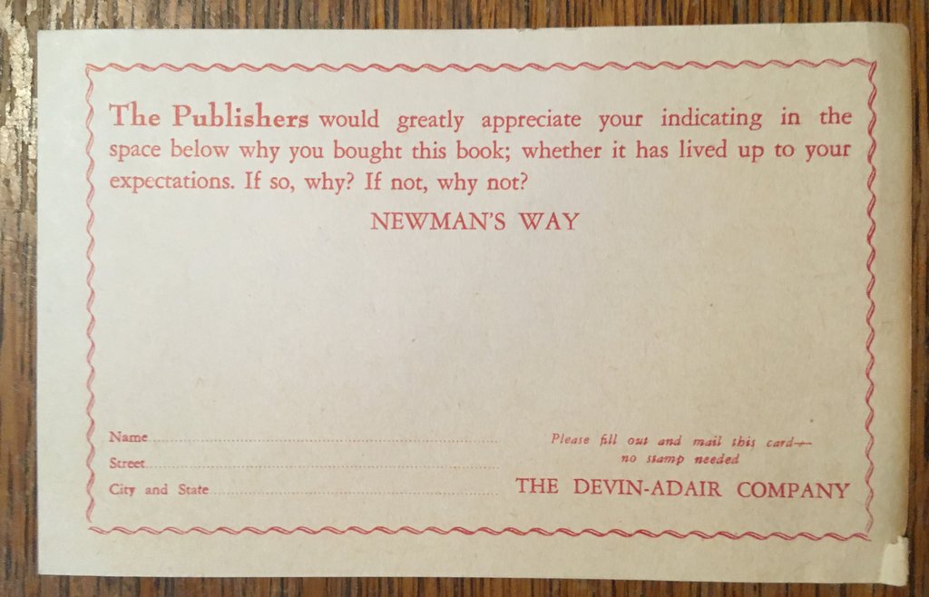 This book came into my hands more or less accidentally, as part of a deceased clergyman's library intercepted on its way to Goodwill. It was published in 1952. Stuck between the pages I found this seventy-year-old postcard supplied by the publisher, perhaps used by the original owner as a bookmark, as it now is by me: