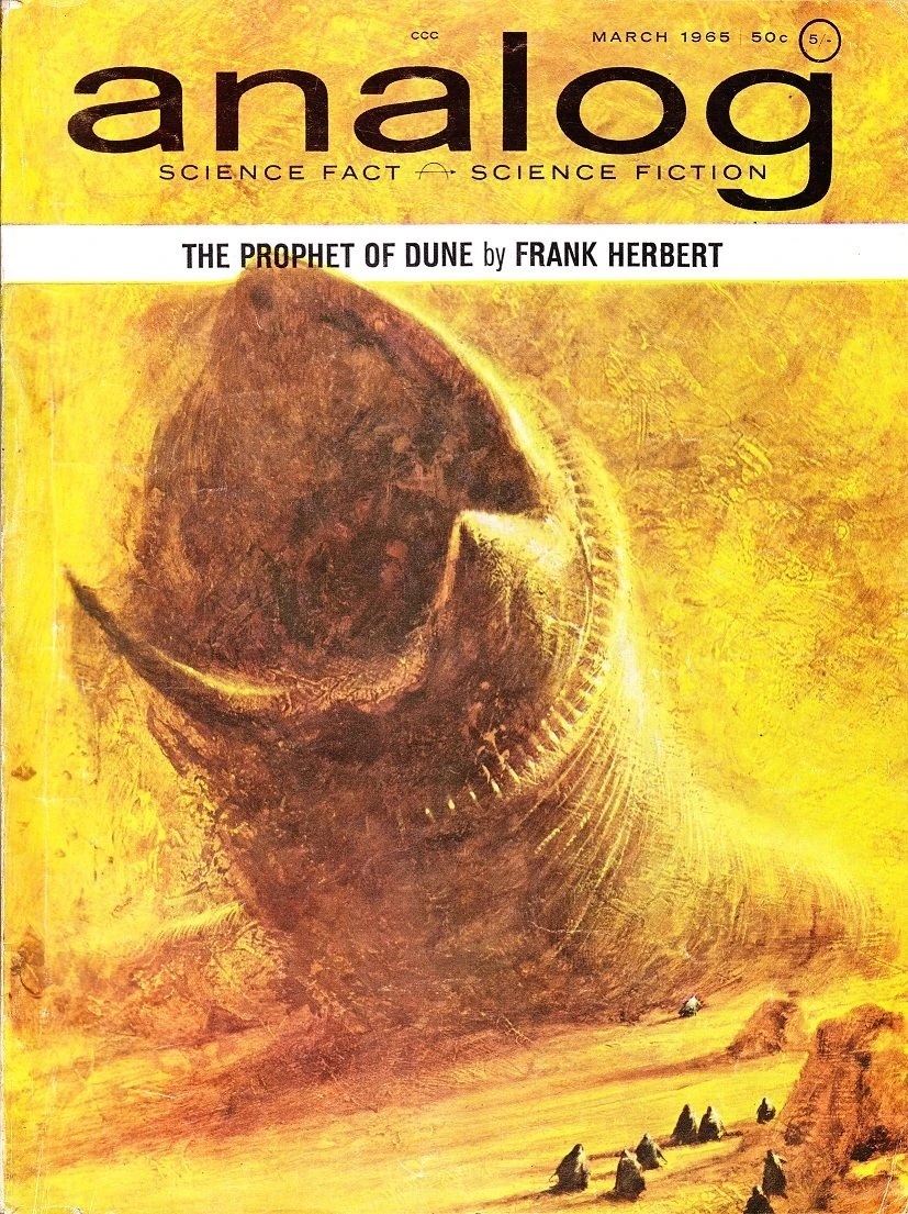 I said "again," and there is a little bit of mystery about that for me. I definitely read it around 1976, for what I think was the first time. But when I was in high school in the mid-'60s I was a science-fiction fanatic, and subscribed to Analog magazine, in which Dune was serialized at the time. As best I can tell from Wikipedia, this was done under two different titles, two years apart. The first, called Dune World, appeared in 1963, in two installments; the second, Prophet of Dune, in 1965, in five (!) installments. I'm pretty certain that was during the period when I subscribed. I even seem to remember this cover: