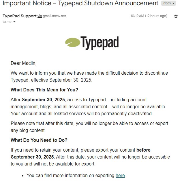 Yesterday I received the following email from Typepad, the blogging service on which this blog is built: